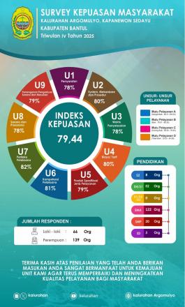 Berikut kami sampaikan survey kepuasan masyarakat (SKM) kalurahan Argomulyo triwulan IV tahun 2025. Terimakasih kepada masyarakat yang telah memberikan penilaian terhadap pelayanan di Kantor Pemerintah Kalurahan Argomulyo. Semoga dengan adanya survey kepuasan masyarakat ini dapat menambah semangat kami dalam melayani masyarakat Argomulyo. Kami menyadari masih banyak kekurangan dalam melayani sehingga perlu adanya saran dan kritik yang membangun guna memperbaiki sistem pelayanan pubik di Kalurahan Argomulyo sehingga kami dapat memberikan Pelayanan Prima kepada seluruh masyarakat Argomulyo pada khususnya dan semua pihak yang meminta pelayanan di Kalurahan Argomulyo.