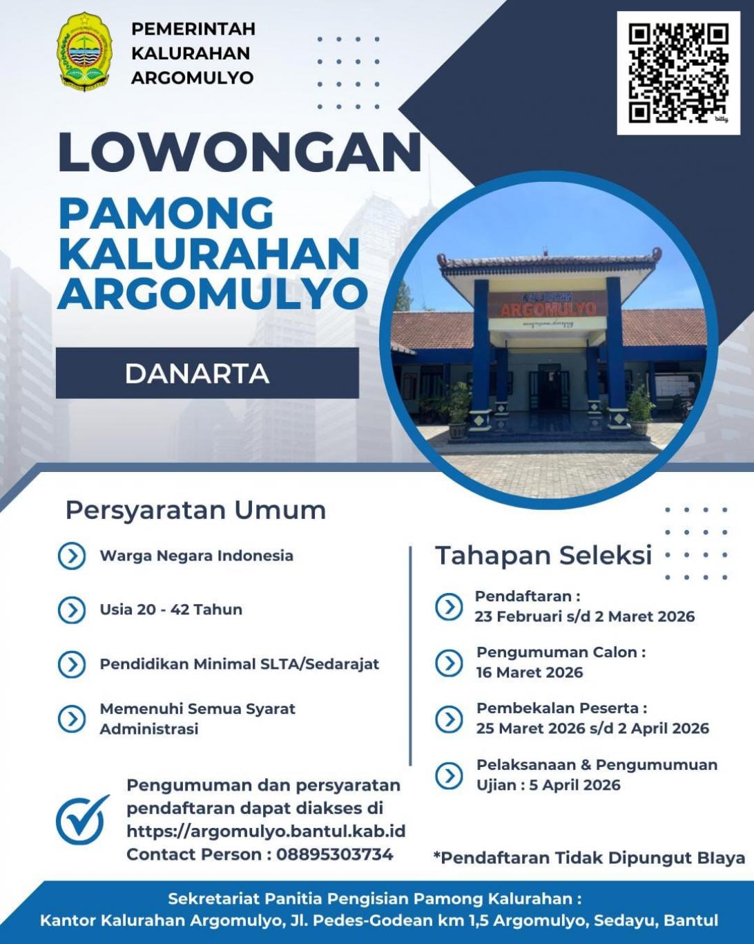 - Pemerintah Kalurahan Argomulyo pada tahun 2026 akan melaksanakan proses pengisian pamong kalurahan Argomulyo untuk Formasi : Danarta